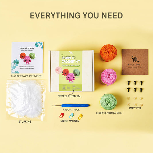 Crochet Kit for Beginners, Learn to Crochet Kits for Adults and Kids, Animal Amigurumi Crochet Kit with Step-by-Step Video Tutorials for Right- and Left-Handed People, Baby Octopus